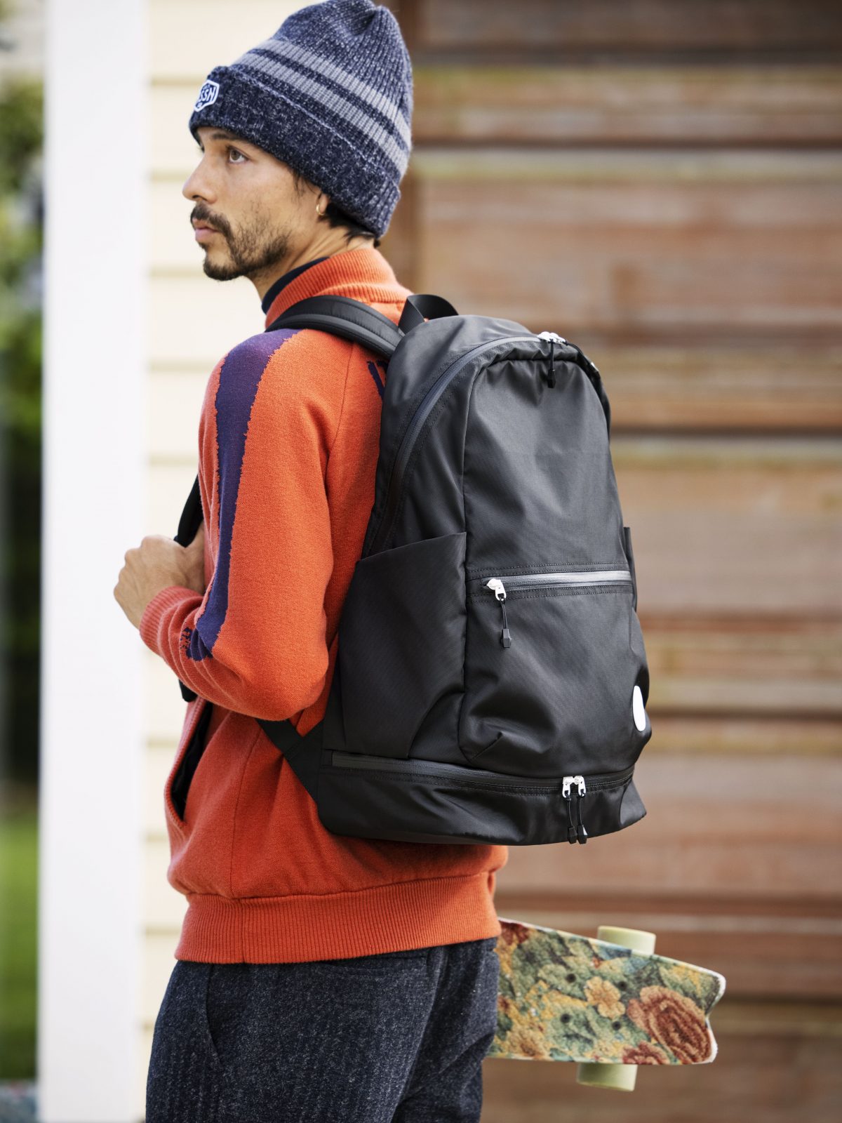 魚網のリサイクルナイロンを使用した『リュックサック』(18,700円 ※オンライン限定販売)もラインナップしており、こちらもたっぷりの収納力と軽量さを両立しています。赤ちゃんの指が引っかからないようにメッシュの代わりにネオプレン素材を使用したり、紐の先をコンパクトにまとめられるようにしていたりと、細部までこだわった仕様も見逃せないポイントです。