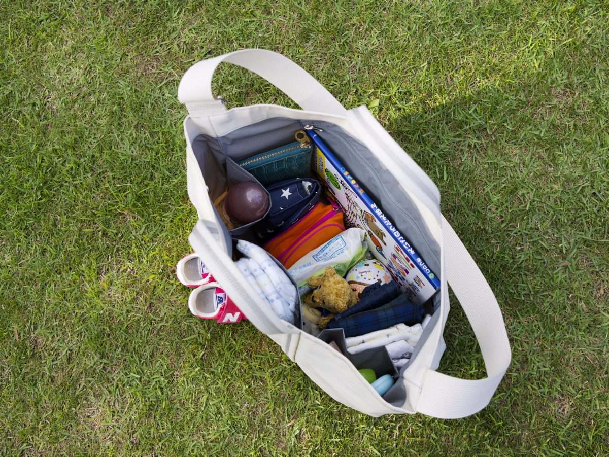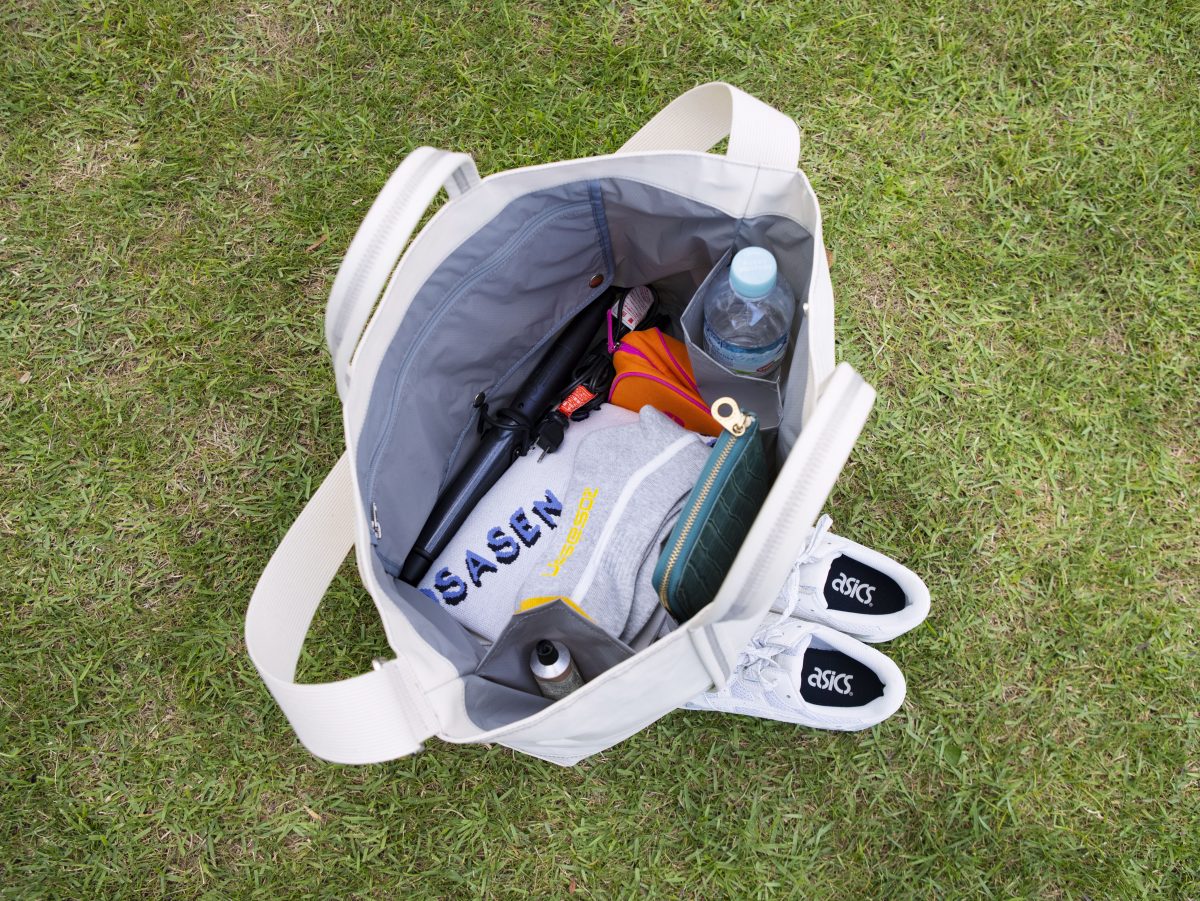 たっぷりとした収納部は口枠が大きくてモノを出し入れしやすく、内側にはペットボトルや哺乳瓶を入れておくのに便利な仕切りを、下部にはおむつやゴルフシューズが入る大容量の別ポケットを備えています。さらに、手持ちのハンドルと肩掛け用のストラップが両方ついていることに加え、自立する形状を採用するなど使い勝手は抜群。それでいて、一般的な帆布トートに比べて大幅な軽量化を実現しているのがうれしい。