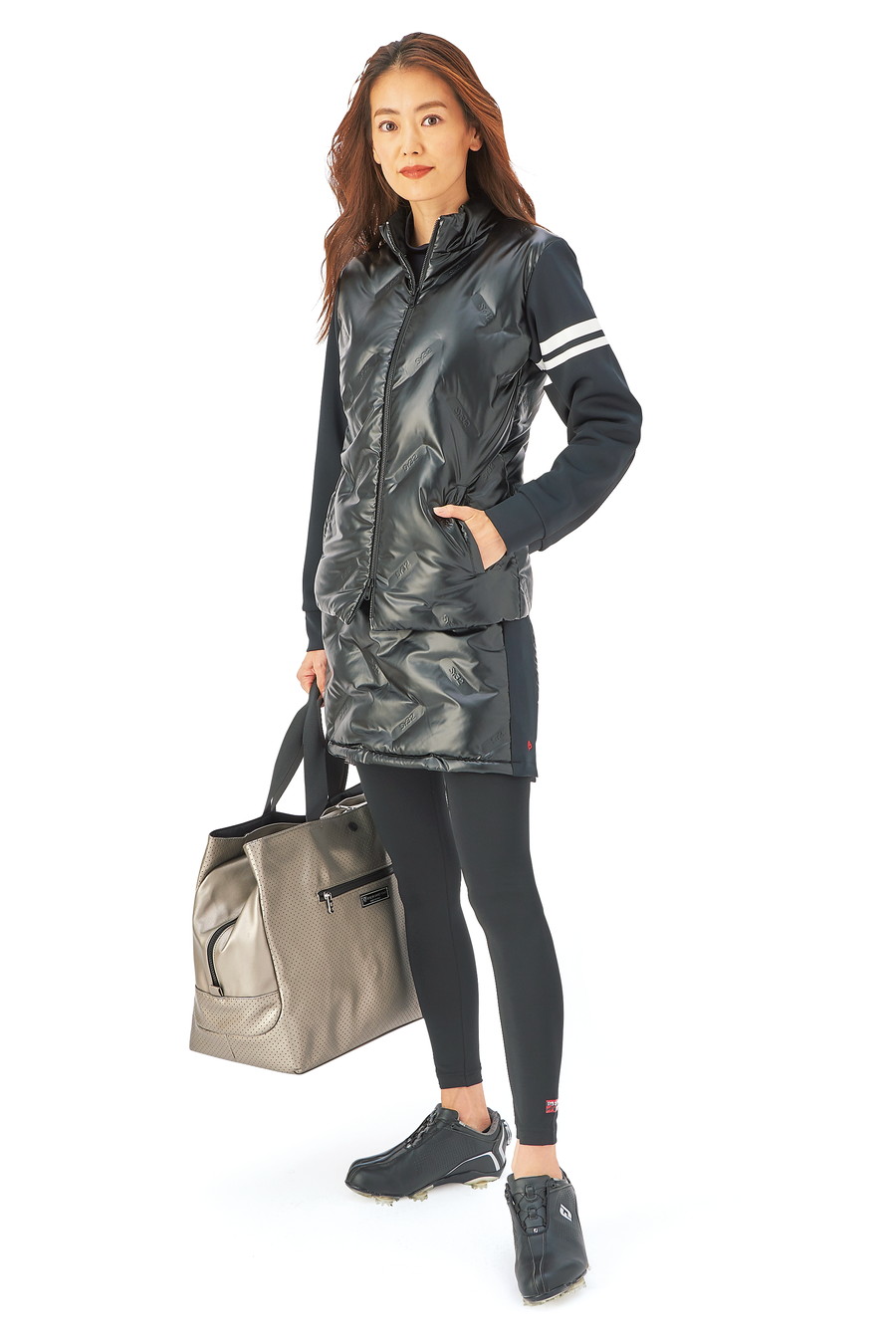 冬ゴルフに欠かせない防寒中綿セットアップ。さりげないロゴ型押しが、カッコいい存在感を発揮します。単調になりがちな黒は、素材感の切替デザインで今っぽくアップデートして。ブルゾン:30,800円、モックネックシャツ:13,200円、スカート:19,800円、レギンス:7,700円、ロッカーバッグ:19,800円(すべてエスワイサーティートゥ バイ スウィートイヤーズ)、その他スタイリスト私物。