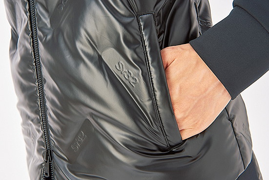 ロゴを型押ししたスタイリッシュなデザインが魅力の光沢感のある中綿素材ジャケットは、袖の異素材切替と、ラインが特徴的。