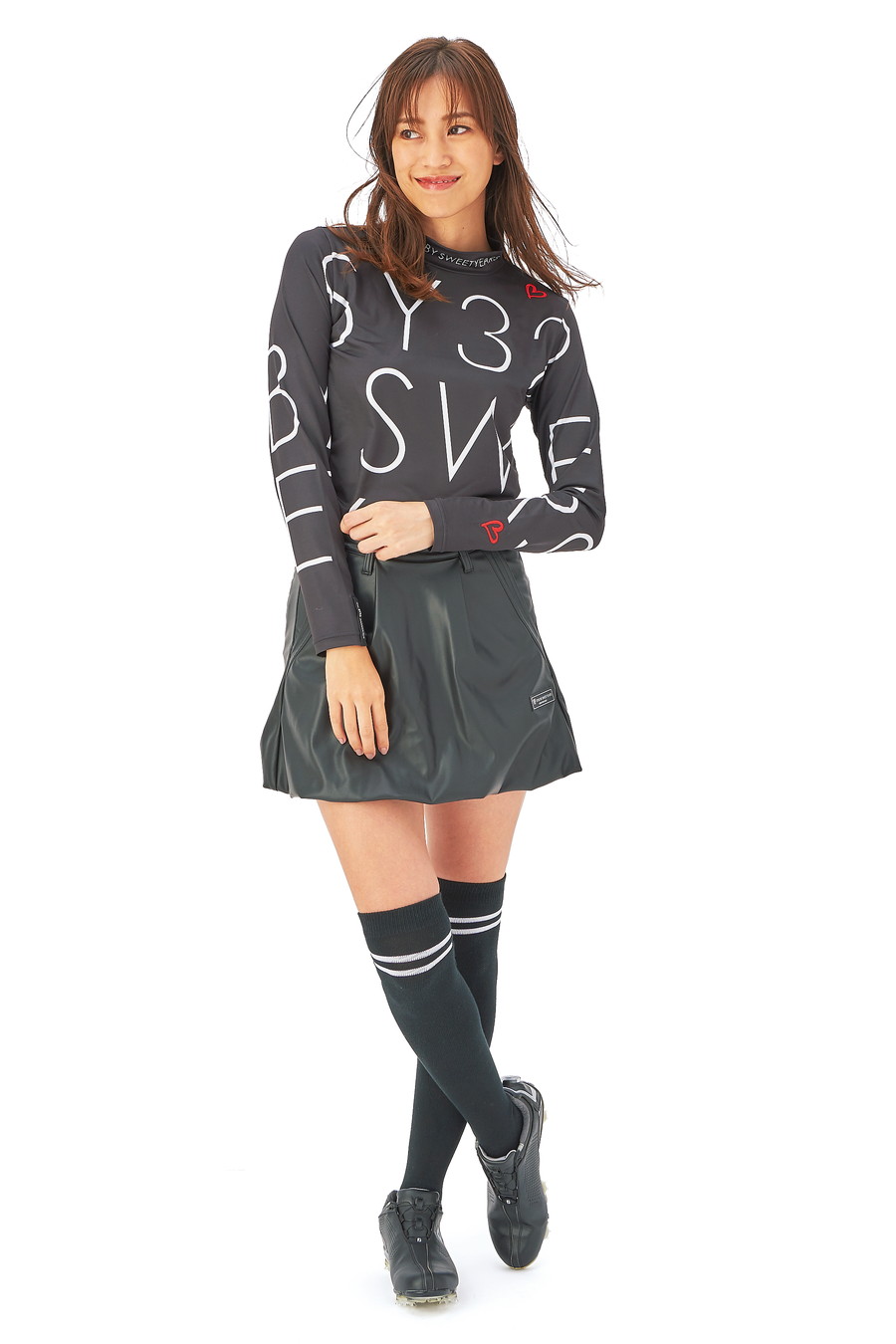 モードになりがちなブラックを軸にしたモノトーンスタイルは、BIGなSYロゴデザインのモックネックシャツや、バルーンシルエットのエコレザースカートで、ほどよく女らしさをキープ。袖のハートのアイコンがワンポイントに。モックネックシャツ:14,300円、スカート:19,800円、ソックス:4,950円(すべてエスワイサーティートゥ バイ スウィートイヤーズ)、その他スタイリスト私物。