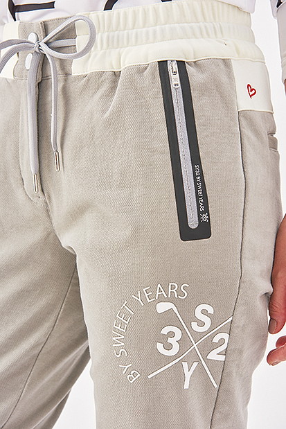 ストレッチ性のあるコーデュロイ素材のドロストパンツは、スポーティなデザインが秀逸。ロゴやウエスト切替がカジュアルに映える。