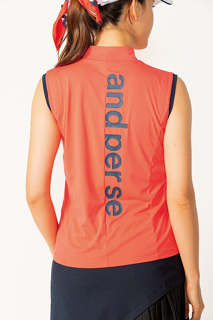 夏らしい元気カラーのノースリーブシャツの背中にはブランドロゴを縦にプリント。洗練されたルックで、バックスタイルもキマります。