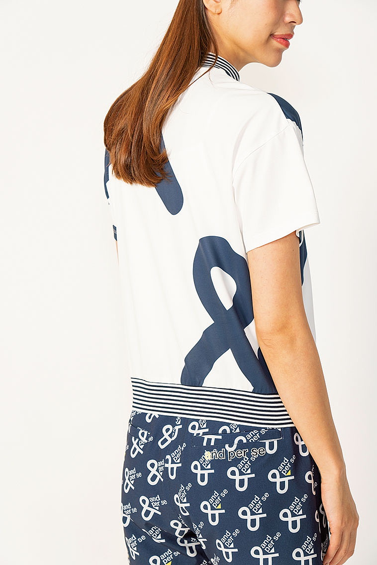 グラフィカルなビックロゴが印象的なモックネックシャツに、「&」ロゴパターンを散りばめたショーツを合わせてポップな印象に。ホワイト×ネイビーの爽やかなカラーリングに小物でベージュを差した大人可愛いスタイリング。キャップ:6,050円、モックネックシャツ:19,800円、ショーツ:15,400円、ソックス:3,300円(すべてアンパスィ)、その他スタイリスト私物。