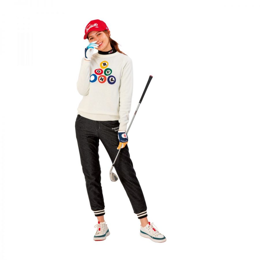カラフルなビリヤード模様を前後に配した12Gニットがキュート。よく見ると、ボールは数字ではなくROUGH&の文字が!背面にはSWELLを採用。カジュアルな裾リブジョガーパンツがこなれ感を後押しする。キャップ:4,950円、ニット:24,200円、タートルネック:12,100円、パンツ:23,100円、シューズ:27,500円、グローブ各:3,960円(すべてラフ アンド スウェル)。