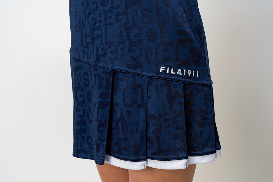 FILA GOLFのロゴをランダムにジャガードで表現した、切替デザインのバイカラーワンピース。一枚でサマになるのでコーデ要らずの、タムパなアイテム。ストレッチ性の高い再生ポリエステル素材を採用し、アクティブな動きもスムーズに。キャップ4,620円、ワンピース10,450円、ソックス990円(すべてフィラ)、その他スタイリスト私物