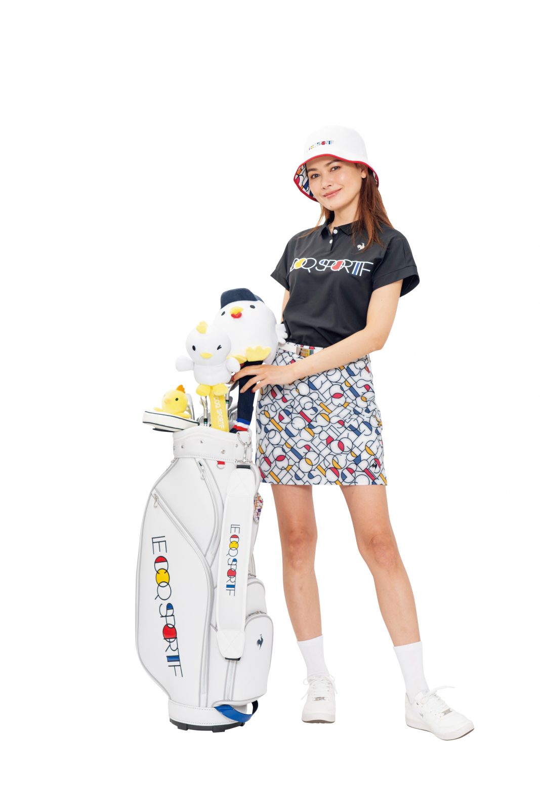 ベーシックな色合わせこそ、色柄の華をプラスしたい。リバーシブルハット6,600円、ポロシャツ12,980円、スカート12,980円、ソックス1,760円、キャディバッグ39,600円、ヘッドカバー「DR」6,600円、「FW」5,830円、「PT」5,830円(すべてデサントジャパンお客様相談室)、その他スタイリスト私物。
