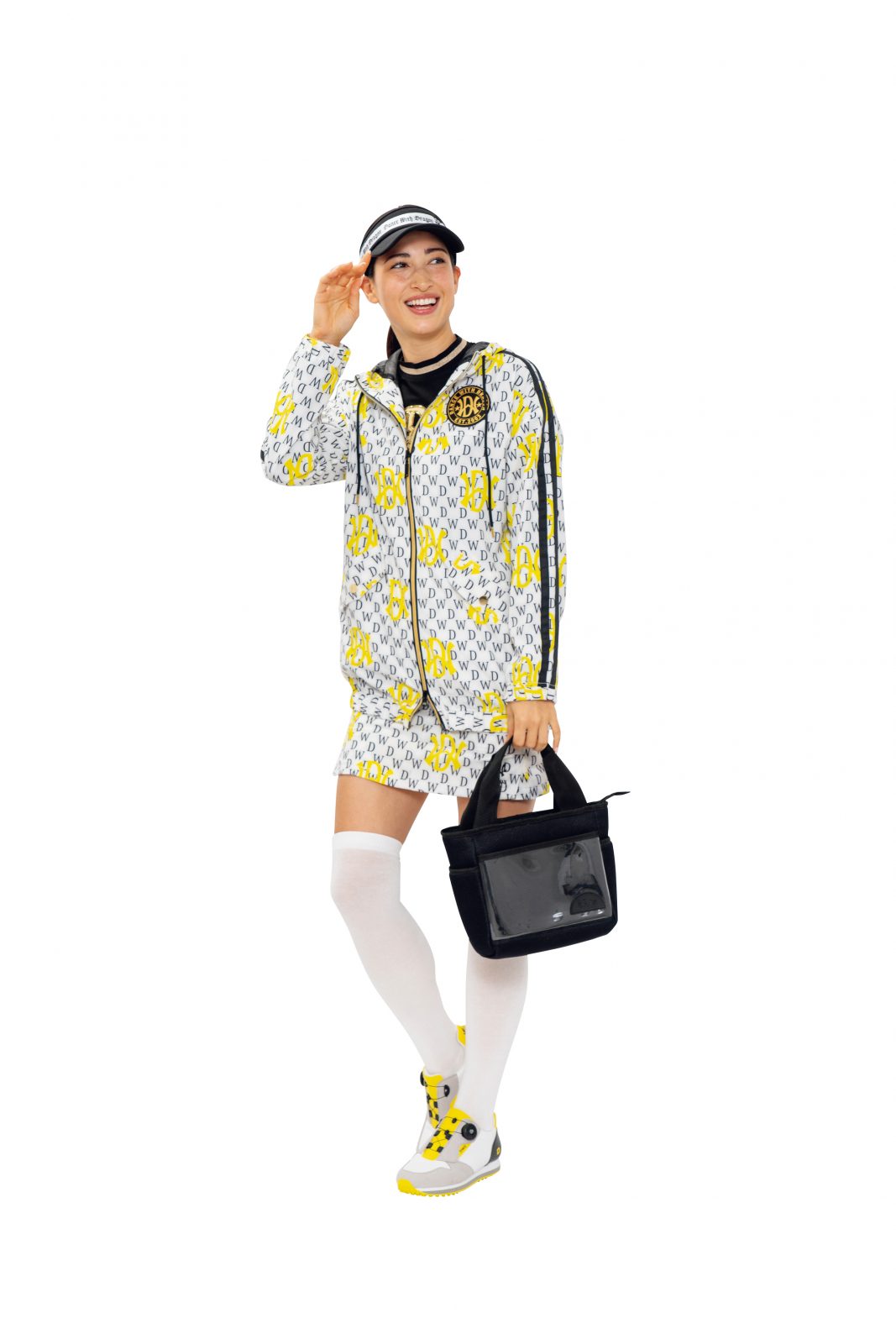 モノトーンに鮮やかなイエローをきかせた、ブランドらしい大胆なモノグラム柄の楽しいムード漂うセットアップ。バイザー11,000円、ブルゾン47,300円、モックネックシャツ25,300円、スカパン36,300円、ニーハイソックス3,960円、シューズ44,000円、カートバッグ19,800円(すべてウィッツ)。