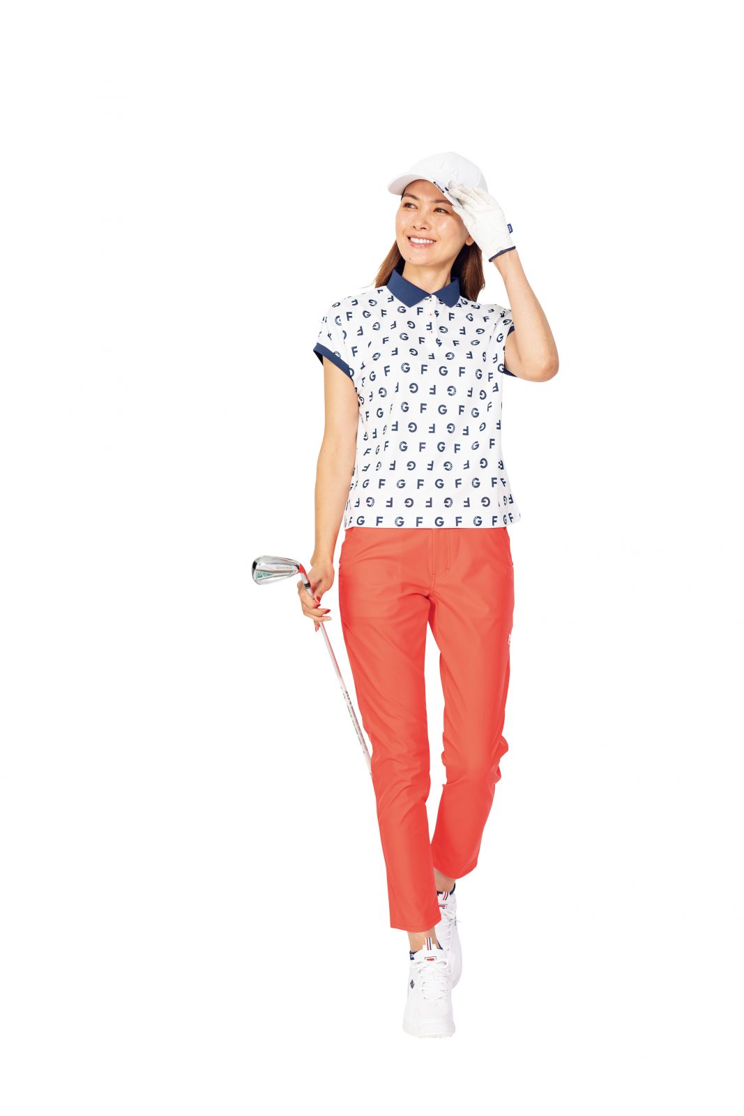 着るだけでハッピー感やトレンドを入手できるモノグラムの総柄シャツには、鮮やかなカラーパンツを大胆にオン。シルエットが美しいのも高ポイント。小物をすべて白で統一すれば、柄オンカラースタイルがすっきりまとまる。キャップ4,620円、ポロシャツ8,690円、パンツ9,350円、シューズ15,400円(すべてニッキー)、その他スタイリスト私物。