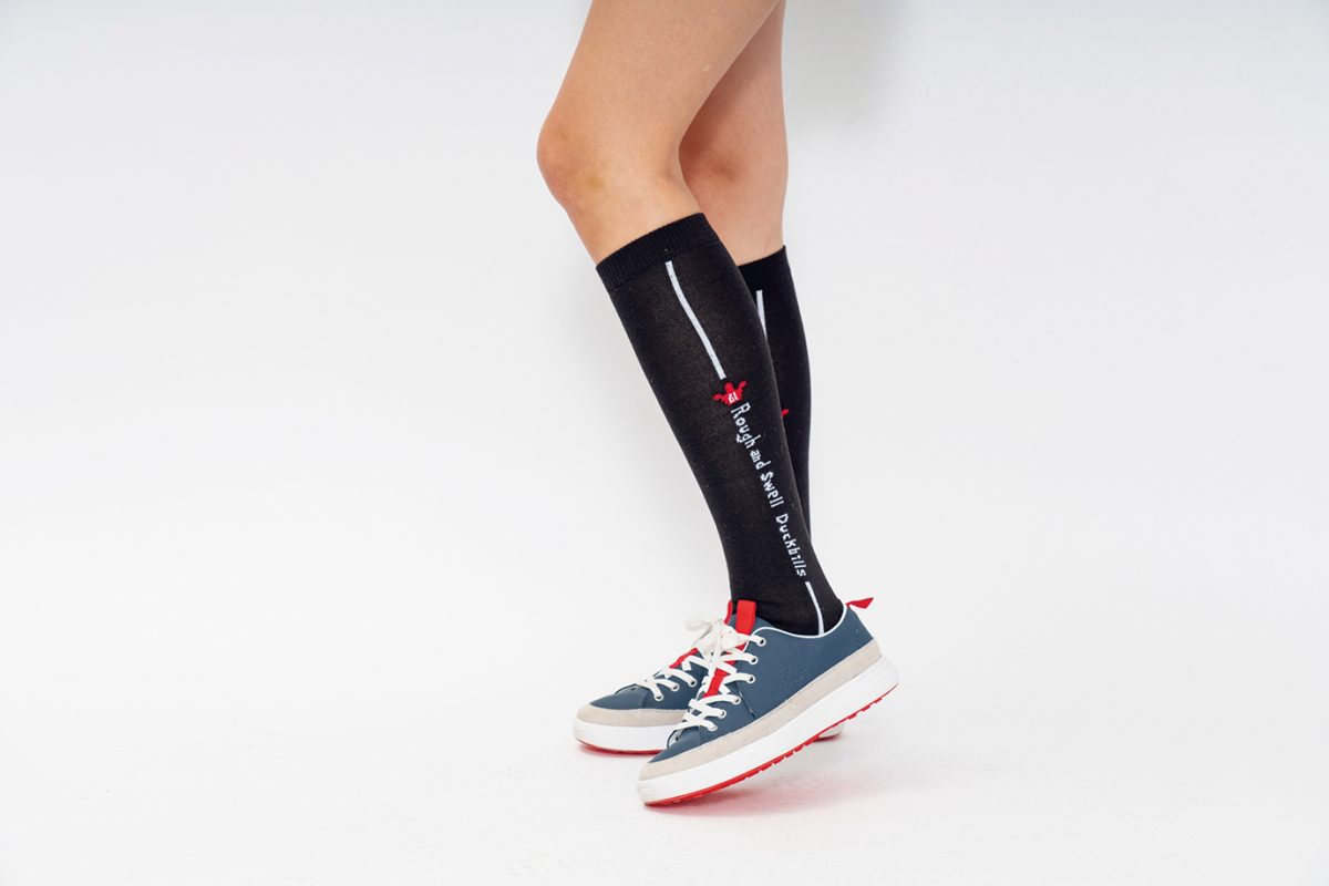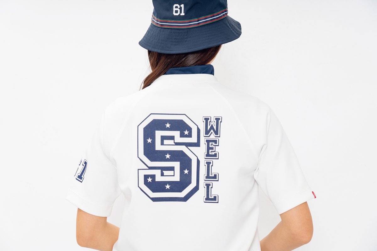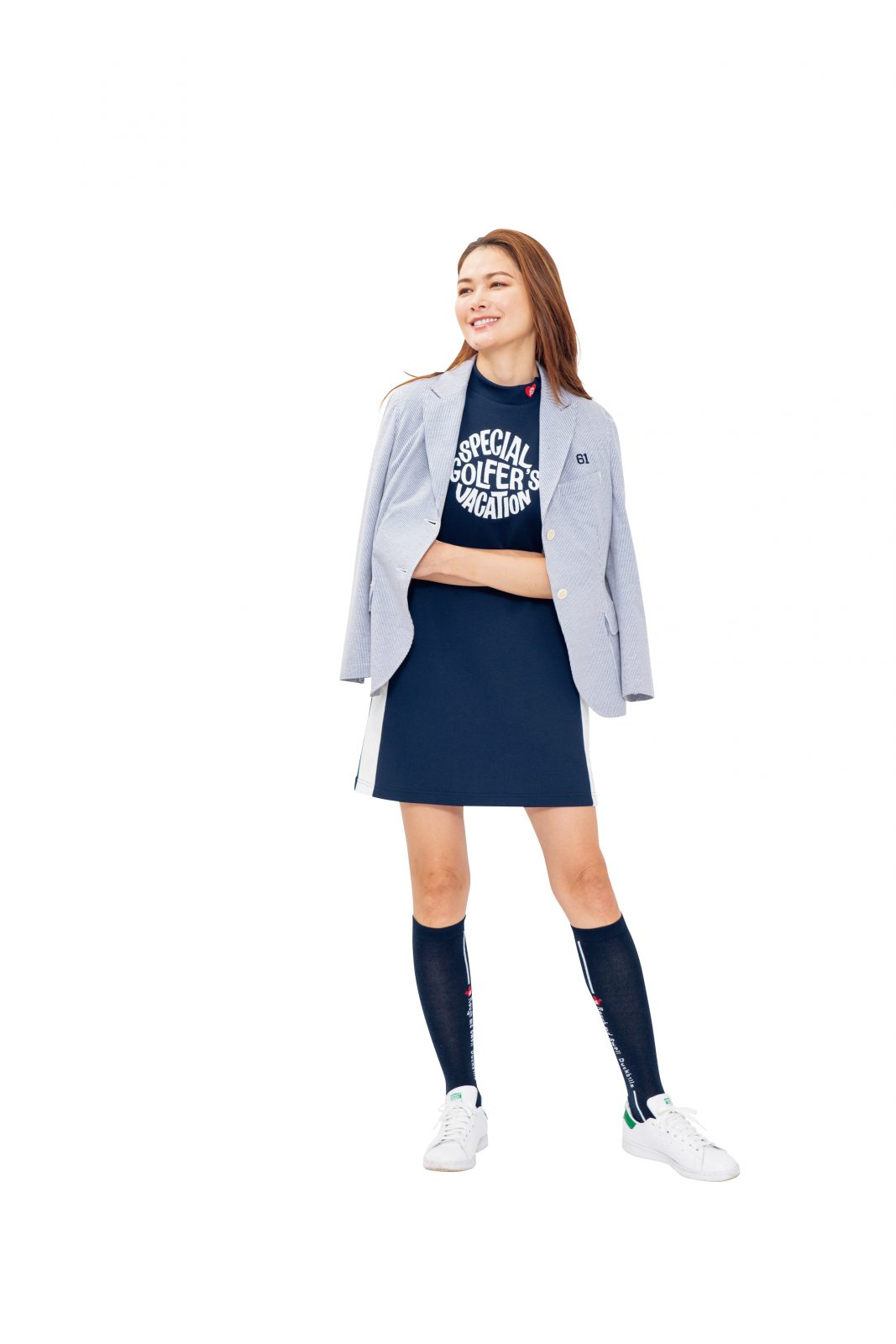 ブランドを支えるゴルファーたちからリクエストが多かったワンピースが初登場。サーファーガールのようなロゴを配したハイネックワンピは、コードレーンの洗練ジャケットを羽織って、行き帰りやコンペの表彰式にも着こなしたい。サンバイザー4,950円、ジャケット33,000円、ワンピース19,800円、ハイソックス3,300円(すべてフーリッシュ)、その他スタイリスト私物。