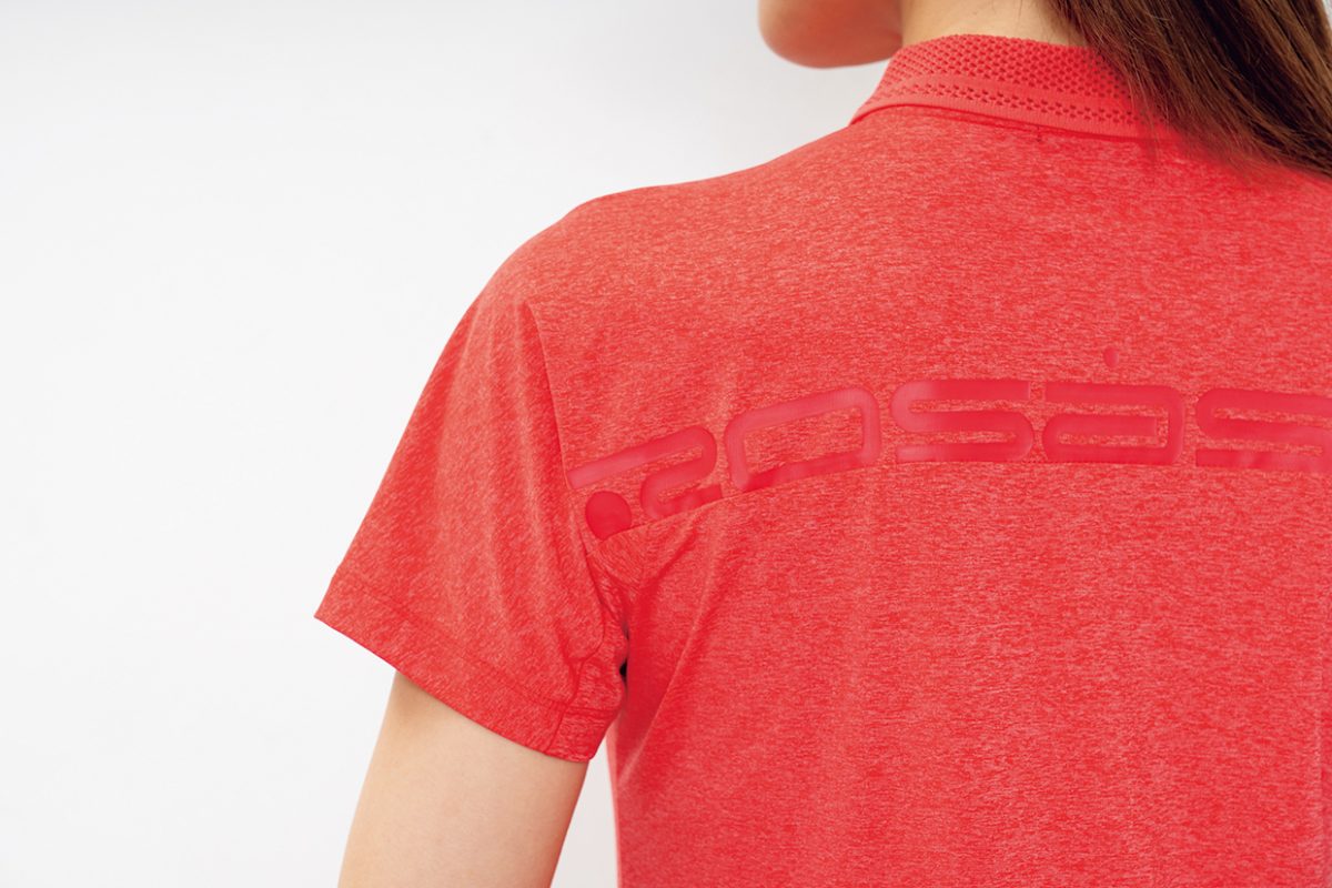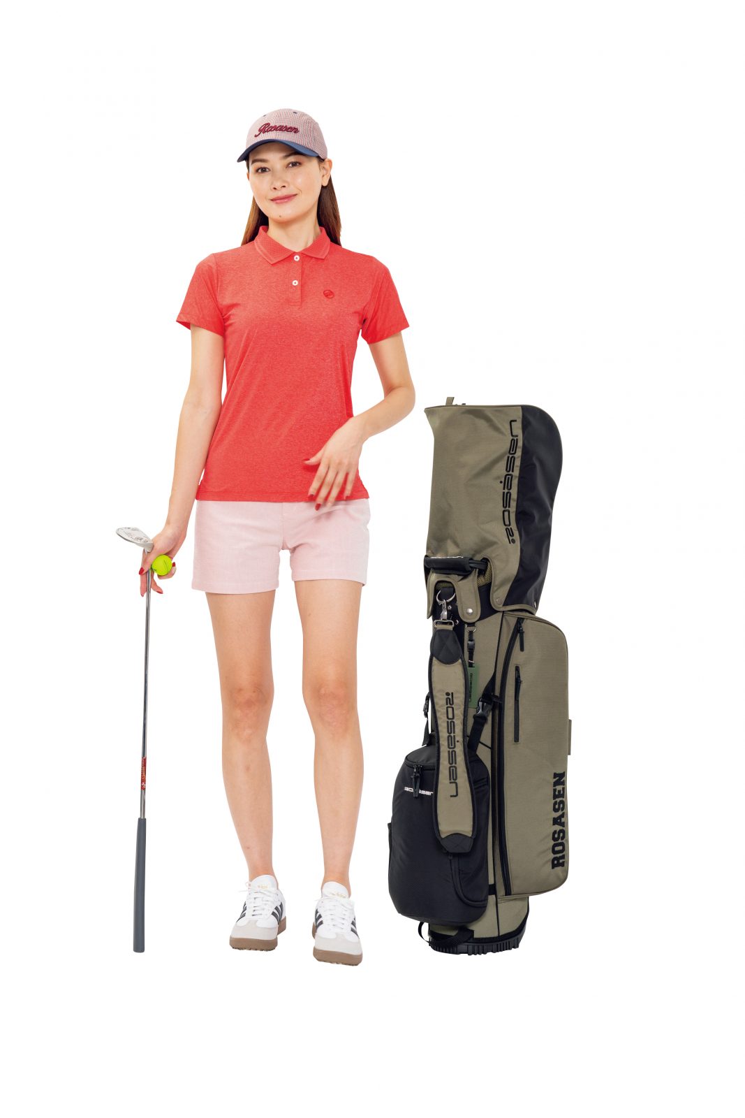 オレンジ系のレッドカラーでまとめたポロシャツ×ショーパンのワントーンコーデは、ヘルシーな雰囲気で魅了。ショーパンはシアサッカー素材で涼しく快適。シャツの襟は可愛いニットメッシュで、細部にまで高いデザイン性を採用。キャップ6,600円、ポロシャツ17,600円、ショーツ16,500円、キャディバッグ49,500円(すべてグリップインターナショナル)、その他スタイリスト私物。