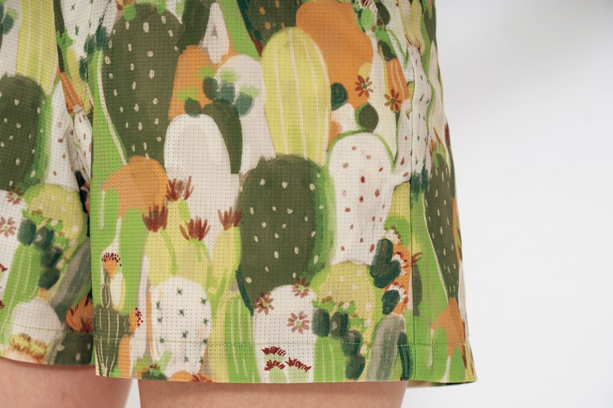 全身に投入したカラフルなプリントは、テキサスに生息するサボテンがモチーフ。新しい自分に出会える大胆なグラフィックを楽しみたい。派手だけどアースカラーだから、意外とターフになじむ。