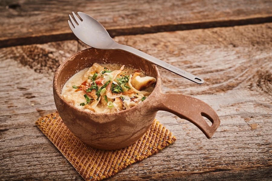 豆乳は常温で持ち運べ、ミルキーでコクのある味わいが満足感を与えてくれるので、山ごはんには欠かせない食材。温めてから酢と合わせることで凝固するので、食べ応えもアップ。シェントウジャンは栄養価の高さから、台湾では朝食でよく食べられているんですよ。