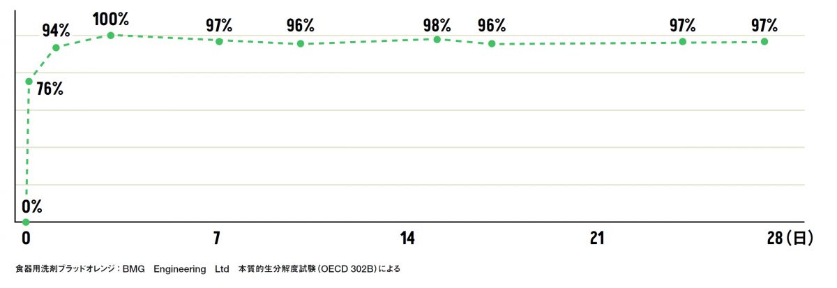 使用後の食器用洗剤は、自然界に存在する微生物によって、「水」と「二酸化炭素」にほぼ100%分解され、自然に還ります*1。