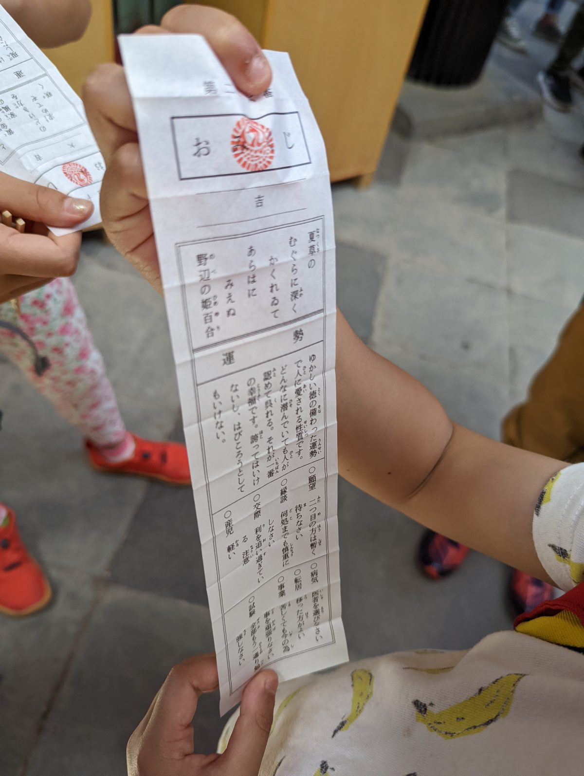 7歳の息子のおみくじには「試験:全部もう一通り勉強しなさい」と書いてあり、大爆笑。先日0点のテストを持って帰ってきたことを、なぜか神様は知っていたんです。