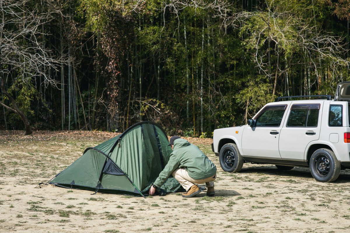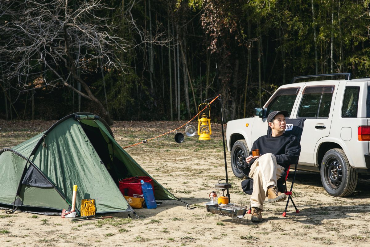 取材をしたのは3月上旬。まだキャンプのハイシーズンではないその季節、ほかのお客さんの予約はとくに入っていないとのこと。昼過ぎに取材が終わり、編集部の担当者とカメラマンが予定通り帰る支度をするなか、僕はひとりソロキャンプをさせてもらうことにした。こんなこともあろうかと、僕はしっかりとソロキャンプの準備をしてきていたのだ。