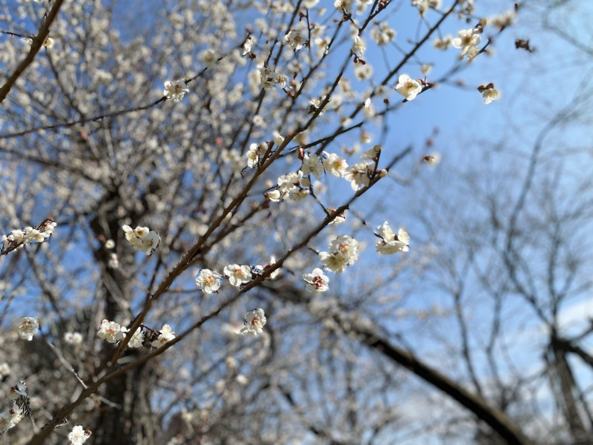 翌朝、軽い二日酔いを感じながらテントを出た。昨日よりも青空が多く、目の前の梅の花がさらに綺麗に咲いていた。