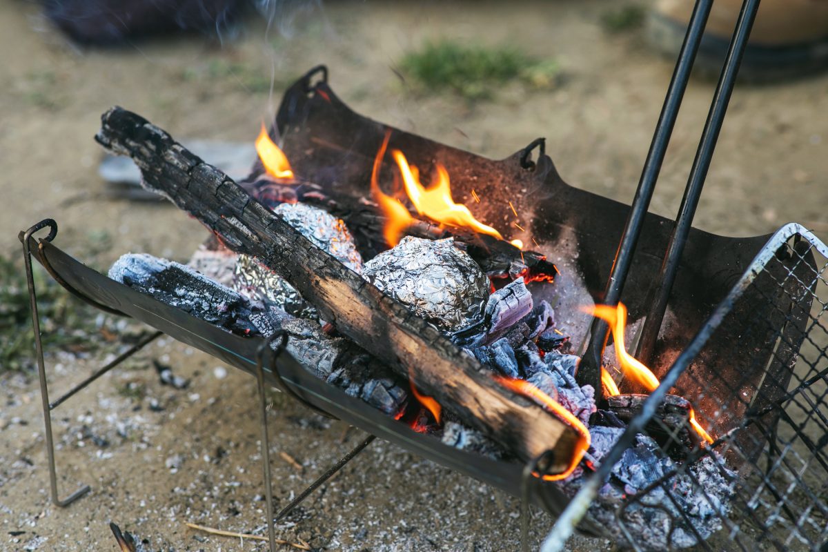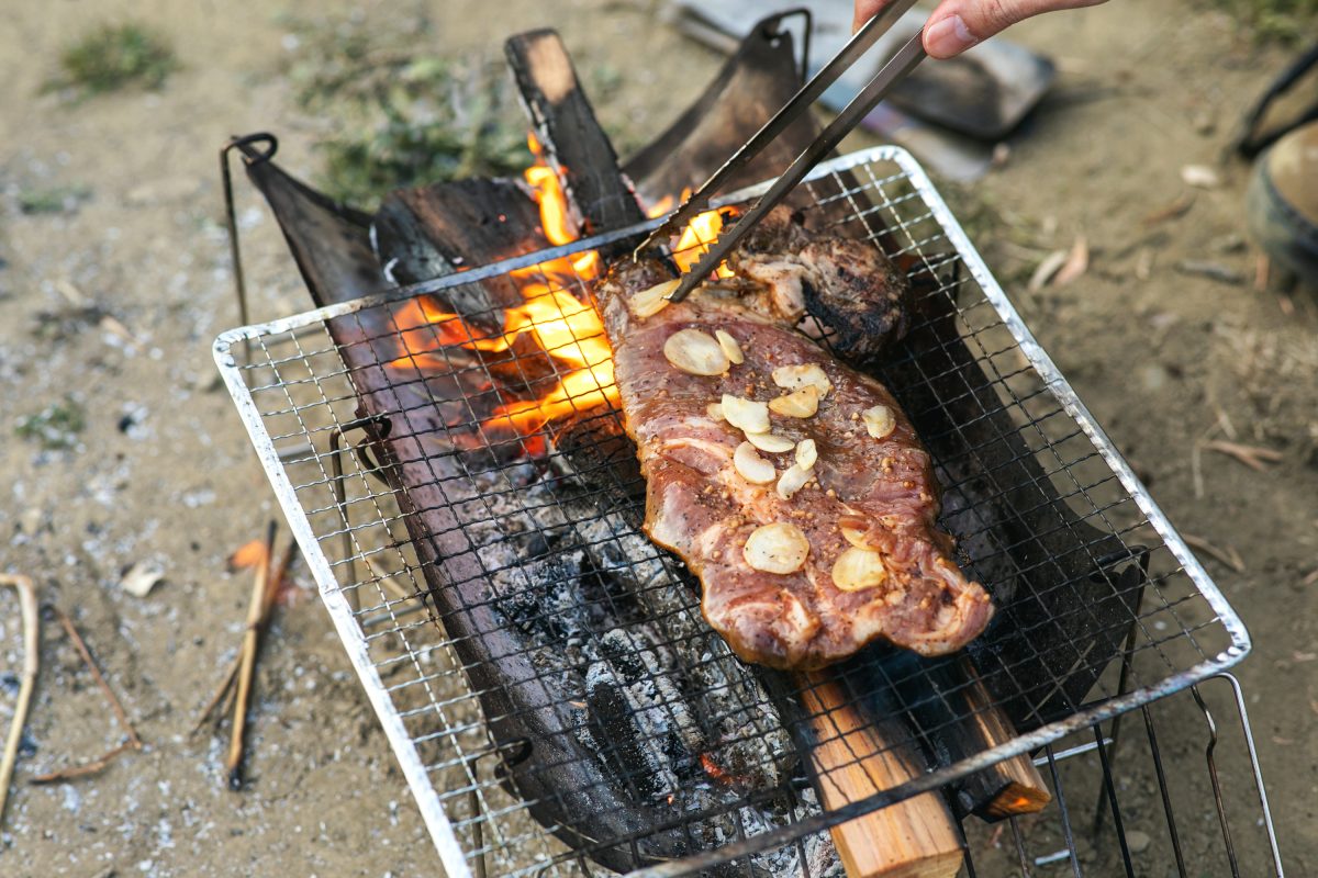 まだ寒い季節だったので、早々に焚き火をはじめ、スーパーで買った味付きの肉を焼く。鉄板を持ってきていなかったので、今回は網を使った。