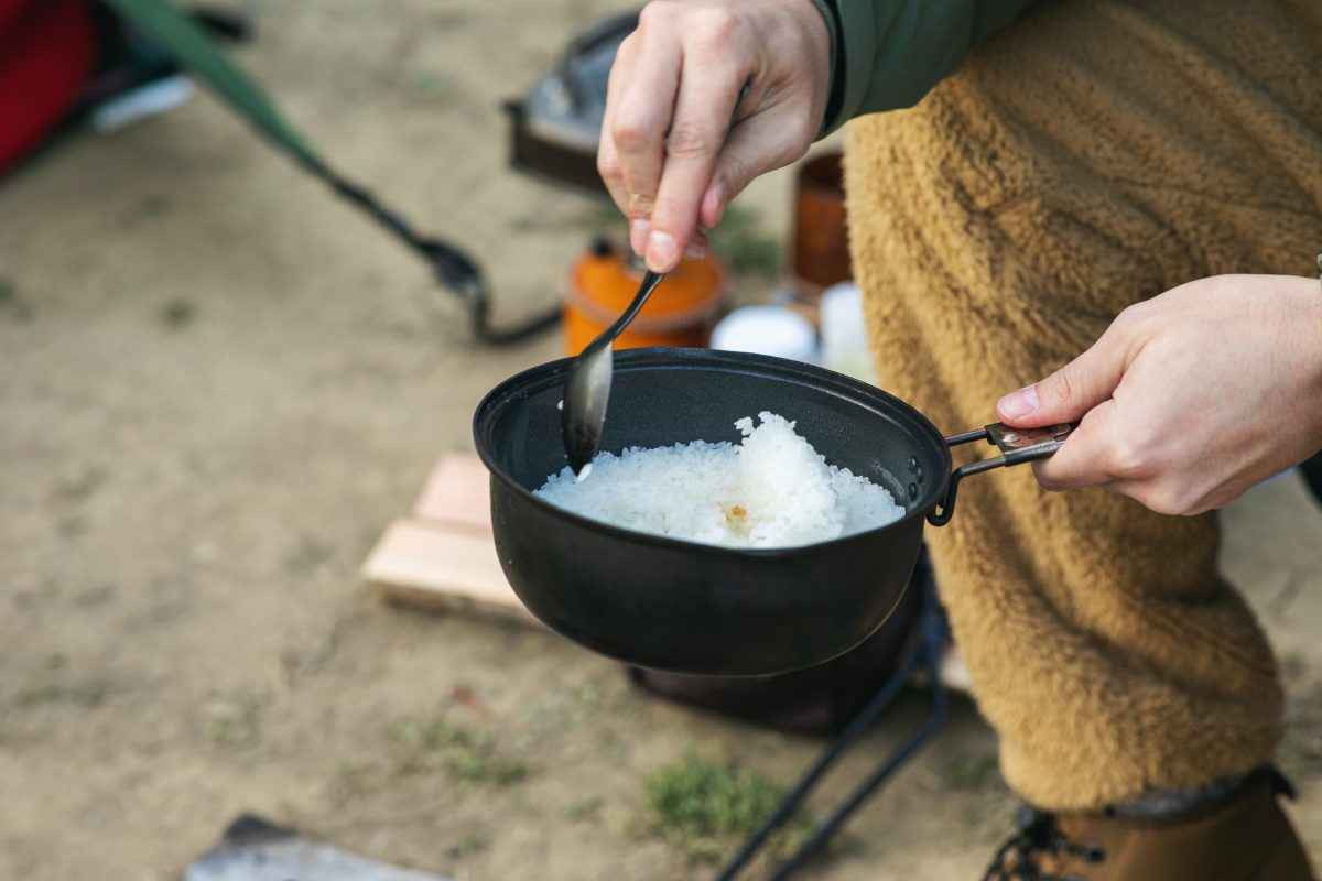 「米を水につける」→「焚き火を始める」→「米を火にかける」→「肉を焼いたりその他の準備」→「米を蒸らす」→「肉を食べてビールを飲む」→「米と一緒に食べる」