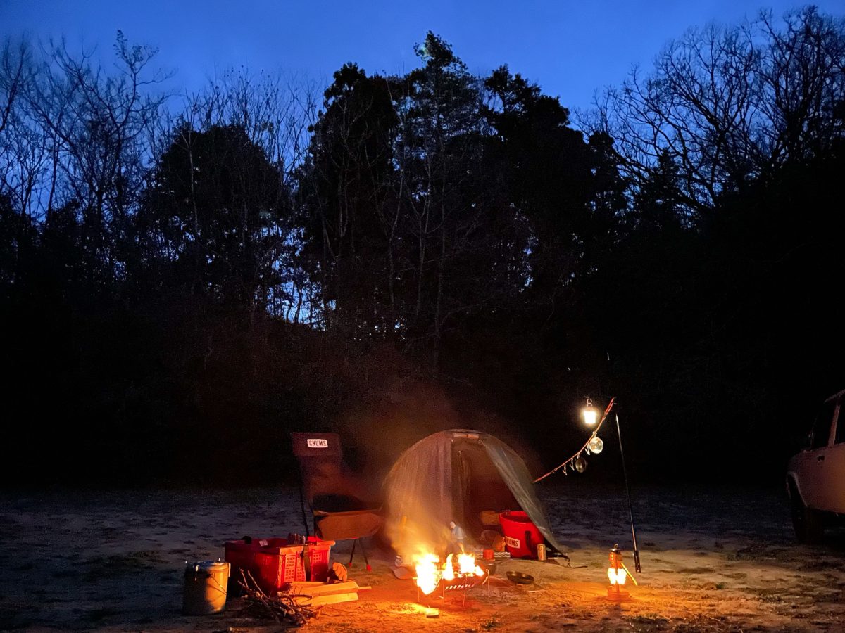 ひとりになりしばらくすると、日が暮れ始めた。ランタンを灯し、焚き火を本格的に始める。結局夜は椅子を使わずに、テントの前に座り込んでのお座敷スタイルとなるのだが、これはその前の一枚だったと思われる。