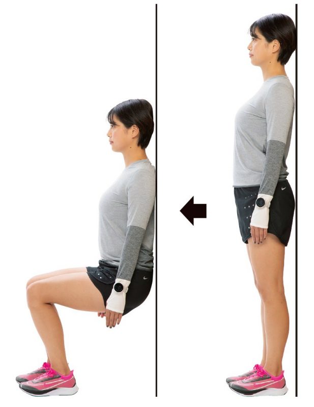 つま先をまっすぐ前に向けて両脚を軽く開き、壁に背中をつけて背すじを伸ばして立つ。壁に背中をつけたままゆっくりと腰を真下に落としていく。太モモと床が平行になるくらいまで腰を落としたら、その姿勢を30秒キープ。慣れてきたら、キープする時間を延ばしていこう。
