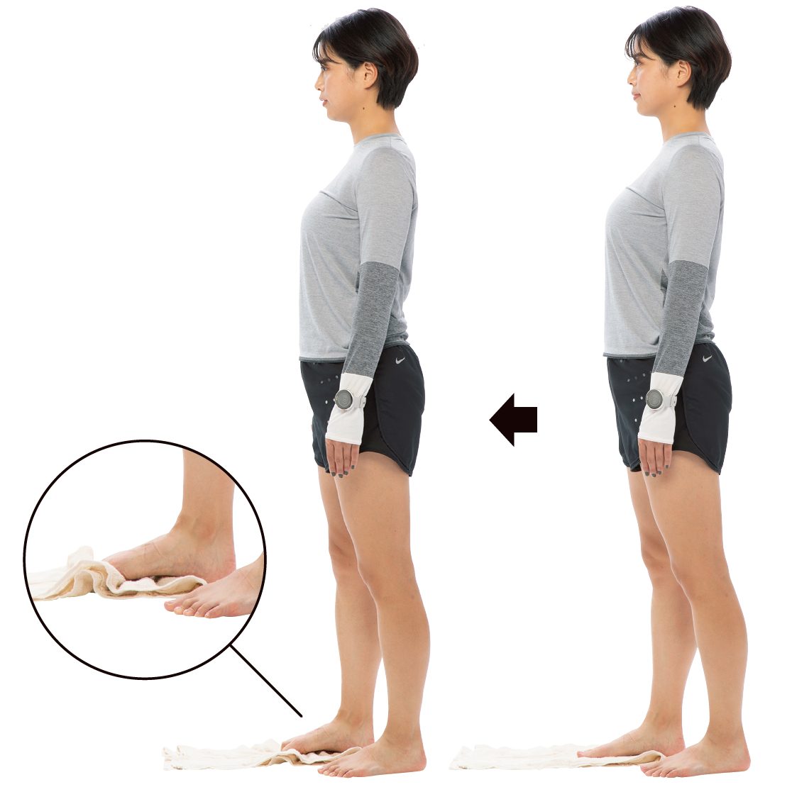 フルマラソン完走レベルのランナーの場合、フォームが安定していないことから着地時の衝撃による脚へのダメージが大きいことが考えられます。そこでダメージを最小限にするための筋肉を鍛えるプラスαのトレーニングも行う必要があります。とくに、足裏のアーチの落ち込みを防ぐことがもっとも重要となります。なかでも、タオルギャザーは毎日でも行ってほしいトレーニングです。