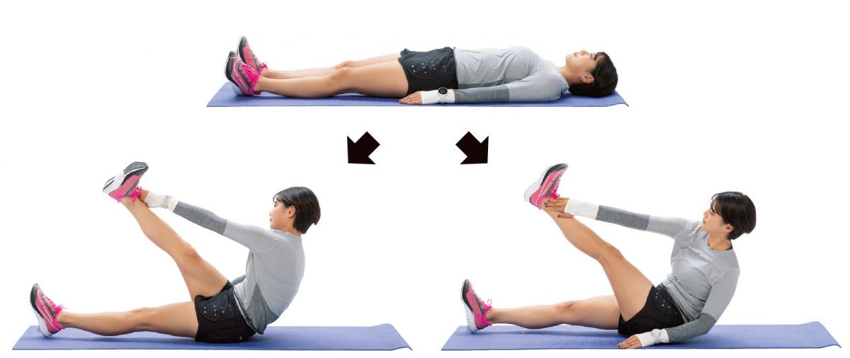 両脚を揃えて仰向けになり、両手は軽く広げる。背すじを伸ばして上体を起こし、ヒザを伸ばして片脚を上げ、対角の手でくるぶしをタッチする。体が硬くてくるぶしまで届かない人は、スネの外側をタッチしてもOK。
