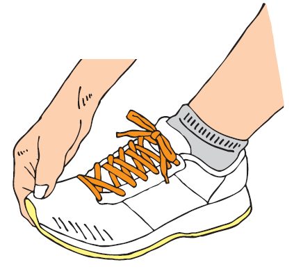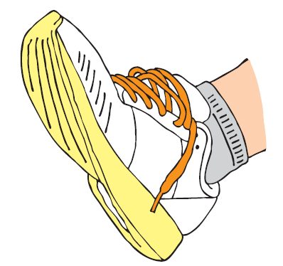 足先のほうまでしっかりシューレース(靴ひも)を緩め、ヒールカップをつぶさないように注意しながらシューズに足を入れます。最後にカカトをトントンとして、カカトをヒールカップに合わせます。