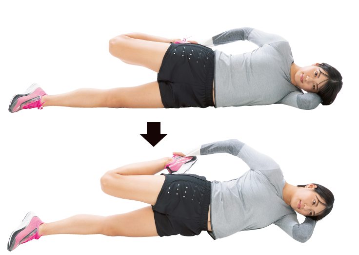 横向きに寝て、片ヒザを曲げて手で足首をつかむ。手で足首を後方に引っ張り、前太モモを伸ばしていく。伸ばしきったら15秒キープ。