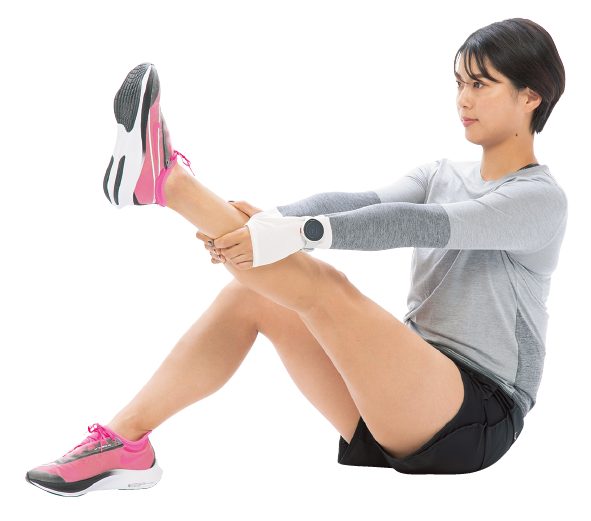 背すじを伸ばして座り、片脚のふくらはぎを持ち、ヒザを伸ばしたまま片脚を上げる。そのまま体側に引きつけていく。ヒザが曲がらないように注意しよう。