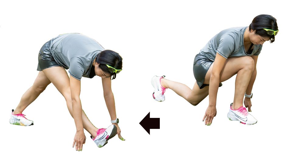 片ヒザを曲げて、前に出した脚をはさむように両手を地面につく。後ろ足のカカトはつけたまお尻を持ち上げて両ヒザを伸ばしていく。