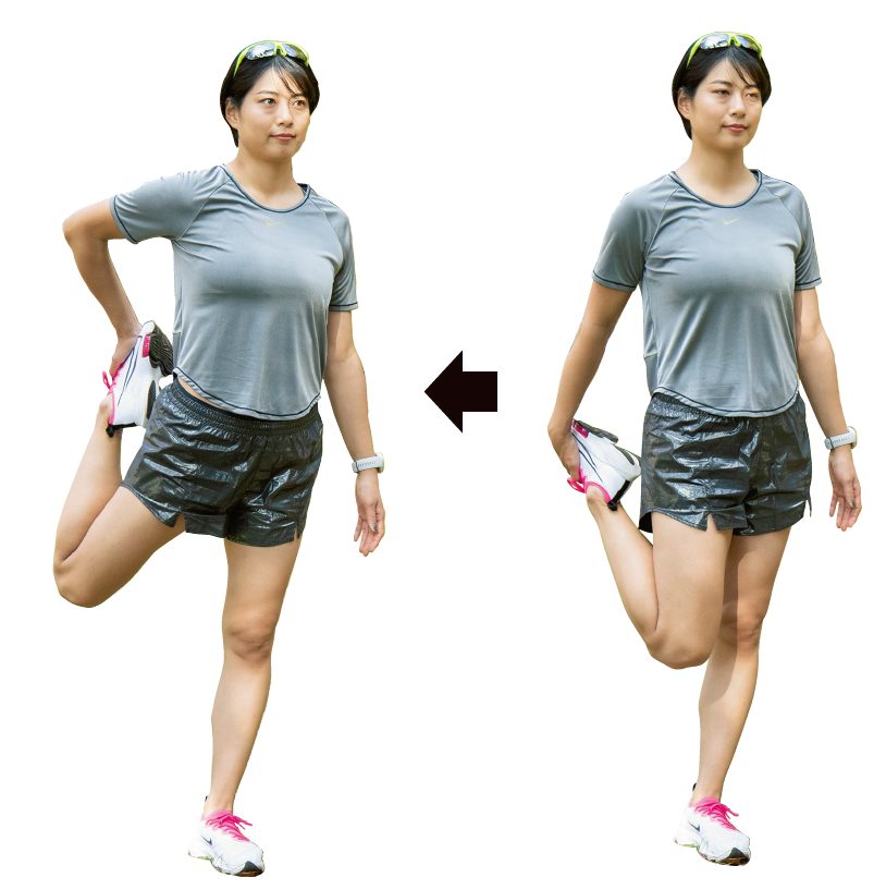 背すじを伸ばして立ち、片ヒザを曲げて、足の甲を手で持つ。バランスを崩さないようにしながら、脚を後ろに引き、再び戻す。これをリズミカルに繰り返す。バランスがとりづらい人は、壁などにつかまって行おう。