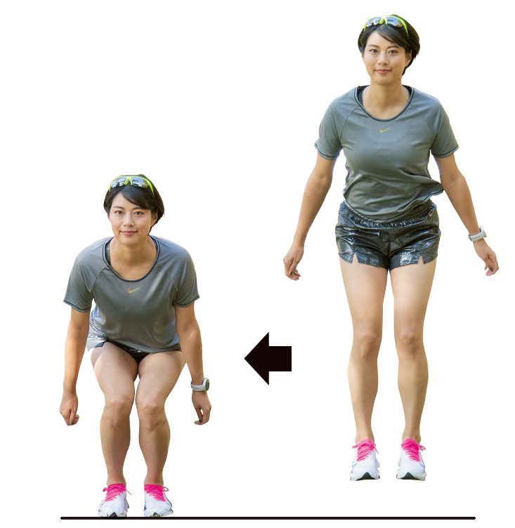 その場でジャンプをして、ヒザを前方に押し出し、曲げて着地する。
