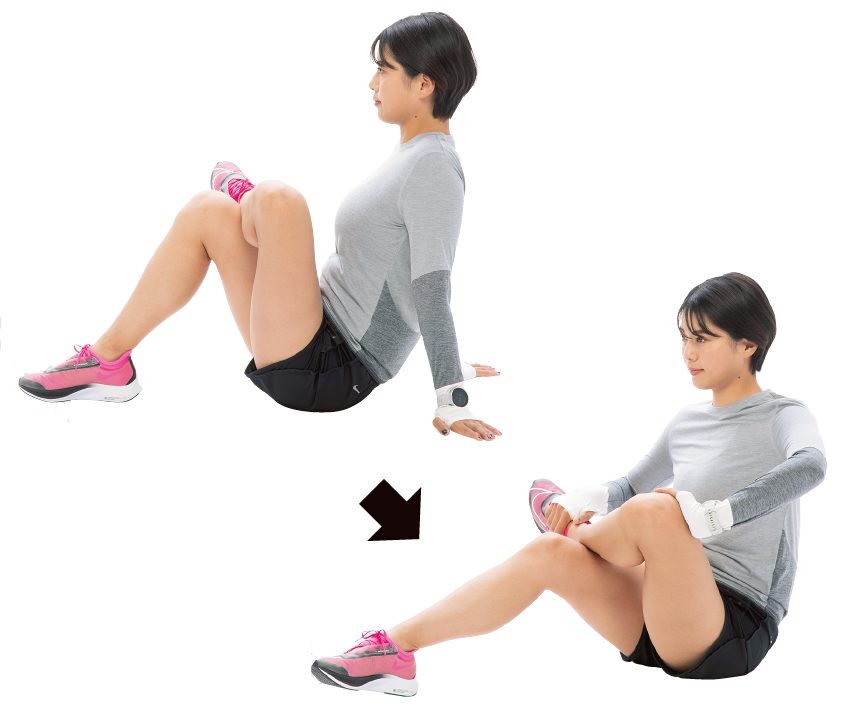 背すじを伸ばして両ヒザを曲げて座り、片脚をヒザにのせる。ヒザをのせた側の脚の手をヒザの横に添えて、ヒザを軽く押して15秒キープ。