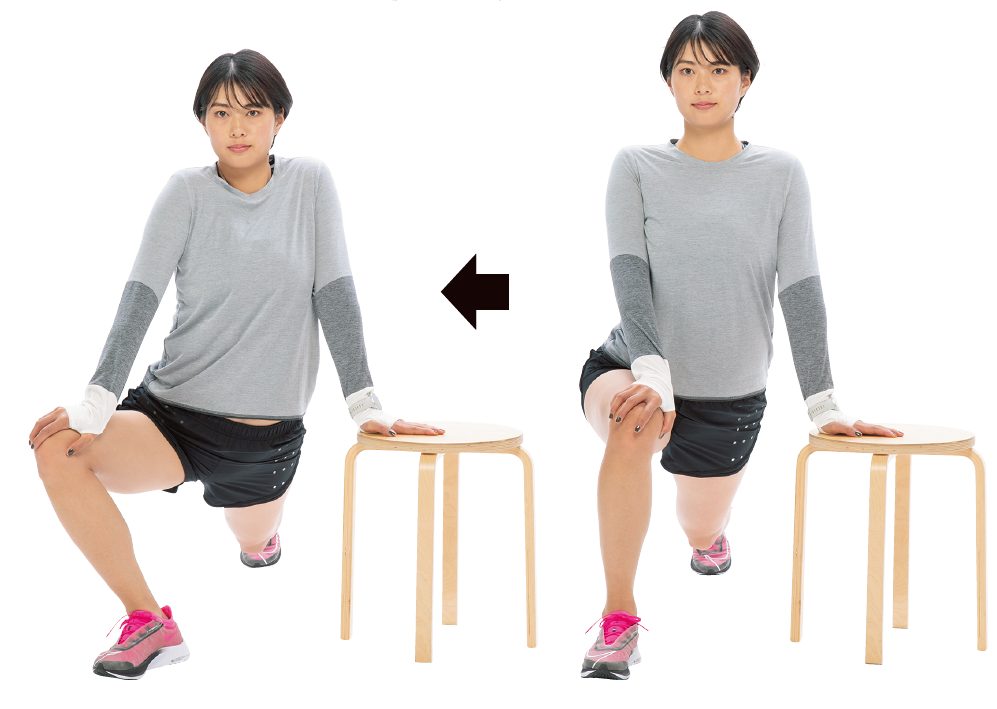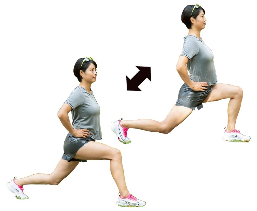 腰に両手を添え、背すじを伸ばして立ち、片脚を大きく前に踏み出す。背すじを伸ばしたまま、太モモと地面が平行になるくらいまで腰を落としていく。落としきったら逆側の脚を前に出し、同様に腰を落としていく。この動きを繰り返しながら10mほど進んでいく。