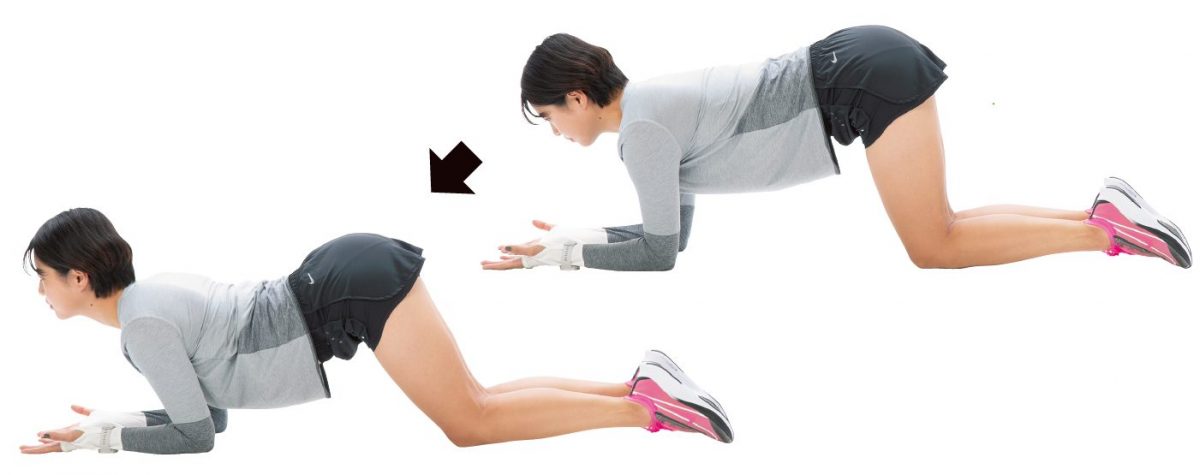 脚を軽く開いて床に肘をついて四つ這いになり、手のひらを上に向ける。息を吐きながら、背中が上から押されて背骨が反っていくイメージで、胸椎部分を反らしていく。反らしきったら10秒キープ。