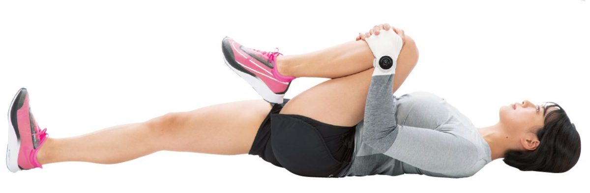 片ヒザを曲げて両手でヒザの皿の下あたりをつかみ、そのまま脇の下方向へとヒザを引きつけていく。引きつけきったら15秒キープ。