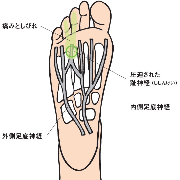足の第3~4 足趾間(中指と薬指の間)にしびれ、痛みが出る障害です。偏平足の人、つま先立ちをすることが多い人や、ハイヒールを履くことの多い人に多くみられます。サイズの合ったシューズを履くようにしたり、インソールなどで矯正することで改善することが可能です。