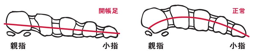 正常な足は正面から見ると、親指から小指のラインがアーチ状になります。しかし、靭帯がゆるむとアーチがつぶれ、親指から小指のラインが一直線になってしまいます。