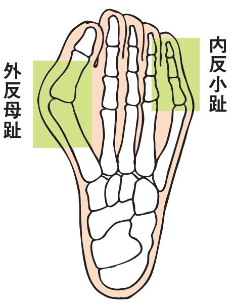 外反母趾とは、足の親指が小指の方へ曲がり、親指のつけ根の関節が「く」の字のように外側に飛び出してしまう状態、内反小趾は、小指が内側に曲がり、小指の付け根が外側に飛び出した状態の足です。シューズを履くと、飛び出した部分がシューズに当たって痛みが出たり、腫れたりします。足指を動かす運動や、足裏のストレッチとマッサージを定期的に行うことで改善することが可能です。インソールやテーピングなどでも悪化は防げますが、重度な場合は外科的手術が必要となります。