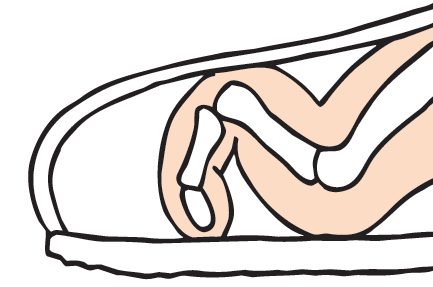 足指を束ねる靭帯が緩み、踏みつけ部の足幅が広くなった状態です。偏平足の人に多くみられ、放置しておくと、最終的には外反母趾や内反小趾になってしまいます。カカトの過度の倒れ込みを防ぐ機能のついたシューズや、アーチサポートの施されたインソールの使用が有効です。