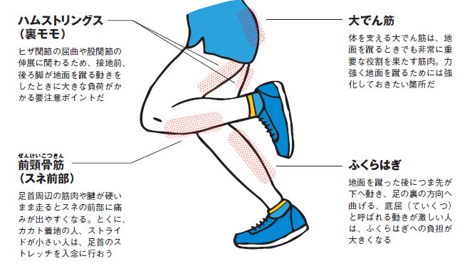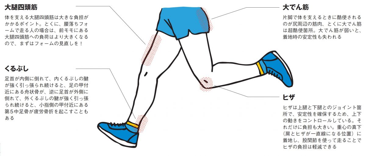 着地時は片足で全体重を支えるため、足全体に大きな負荷がかかります。とくに前太モモ(大腿四頭筋)とお尻(大でん筋)への負荷は大きく、ハリなどの症状が出やすい部位です。また、フォームが安定していない場合は、着地時の体のグラつきがより大きくなるため、体のバランス調整を担うヒザへの負担が大きく、ヒザに痛みが発生するリスクが高まります。