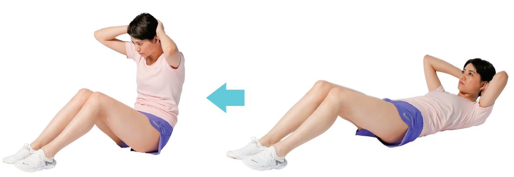 両脚を揃えて床に仰向けに寝る。ヒザは軽く曲げる。手の位置は後頭部に添え、頭を軽く持ち上げる。キツいようなら、手をまっすぐ前に伸ばしてもOK。床からへそをのぞき込むようなイメージで、背骨の一つひとつをゆっくりと床から離していく。勢いをつけずにゆっくり上体を起こしていくことを強く意識して行う。