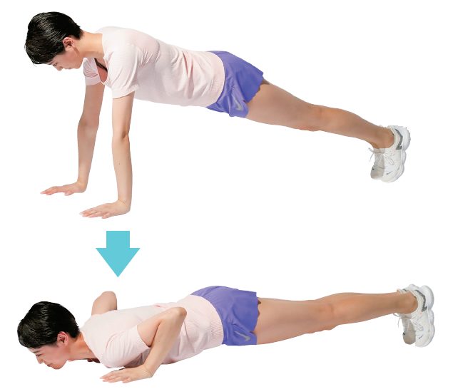 両腕を肩幅よりやや広めに開き、ヒジをまっすぐに伸ばして、つま先を立ちで四つん這いになる。背すじを伸ばして、後頭部からカカトまでが一直線になるような姿勢をとる。体が床と平行になるくらいまでヒジをゆっくりと曲げていく。できるだけアゴを床に近づけることで、負荷を高められる。ラクにできるようになったら、胸が床につくまで上体を下げていこう。キツいようならヒザをついて行ってもOK。