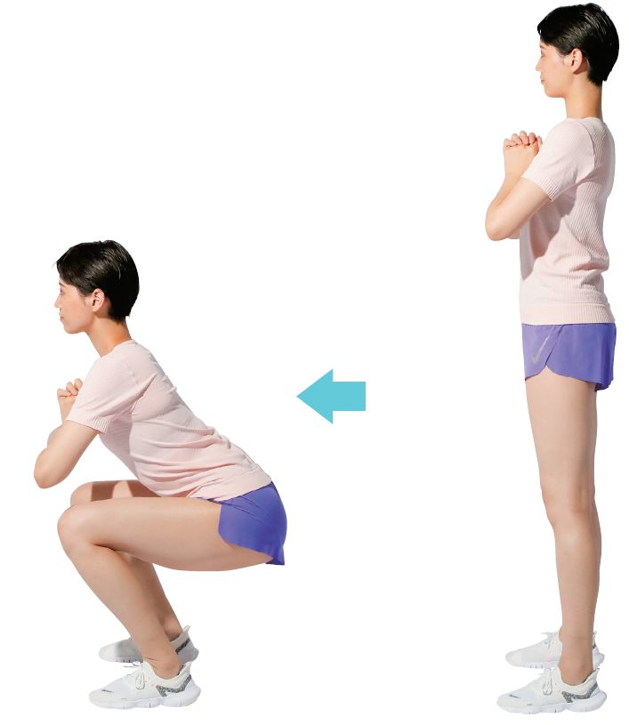背すじをまっすぐにして立ち、両脚を肩幅くらいに開き、つま先は軽く開いておく。両手は胸の前で組んで目線はまっすぐ前を向ける。背すじをまっすぐにしたまま、ゆっくりと腰を真下へ落としていく。太モモと床が平行になるくらいまで腰を落としたら、ゆっくりスタートポジションまで戻す、つま先より前にヒザが出すぎないように注意しよう。