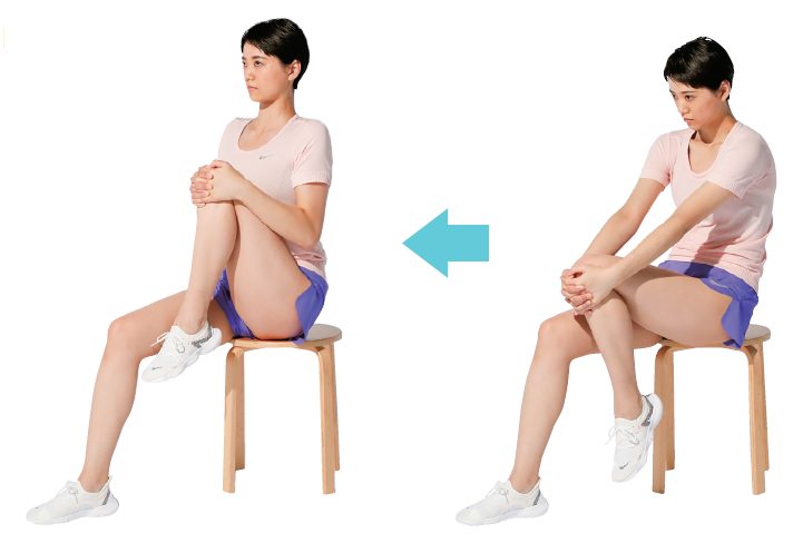 背すじを伸ばしてイスに深めに座る。両手のひらを組んで片ヒザを挟む。そこから、背中を軽く丸めながら、片ヒザを軽く上方に持ち上げていき、そのまま体に引きつけていく。このとき、脚に力を入れ、抱えた手と拮抗する状態をつくる。脚をウエイトがわりにするようなイメージで、腕の力で脚を体に引きつけていくことがポイント。イスは背もたれがないものを使用しよう。