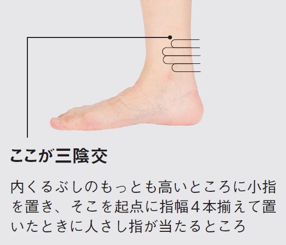 血の巡りをよくするツボです。冷えの改善にも効果的。冷え性の人は、長めのソックスを履き、この部分を冷やさないようにしましょう。消化器、肝臓、腎臓などの働きを助けるとともに、婦人科系の不調を改善するツボとしても知られています。