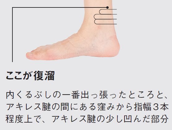 血の巡りを促すツボです。とくに足の冷えの改善に効果的です。体がだるい、疲れがとれにくい、寝つきが悪いときにもおすすめです。腎臓と膀胱の機能を高める作用をもつことから、頻尿改善もサポートします。