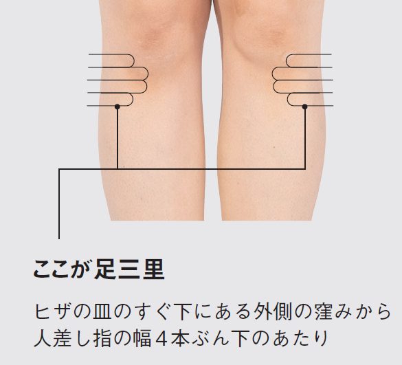 万能養生のツボと呼ばれるほど、さまざまな不調の改善に効果を発揮するといわれています。とくに、慢性的な胃腸不調に悩む人におすすめのツボです。また、足の疲れ、むくみ改善、ヒザの痛み、病気予防、疲労回復などもサポートしてくれます。