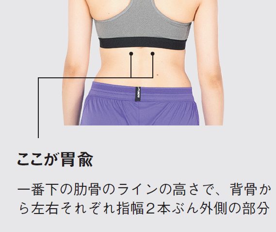 胃兪は内臓の機能を調整し、正常化するツボとして知られています。とくに胃の不調の改善に効果があるといわれています。血の巡りがよくなり代謝もアップ!